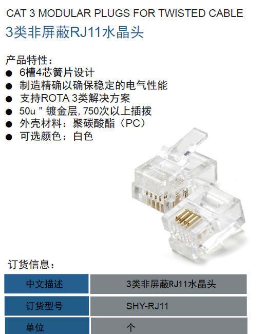 • 3類非屏蔽RJ11水晶頭